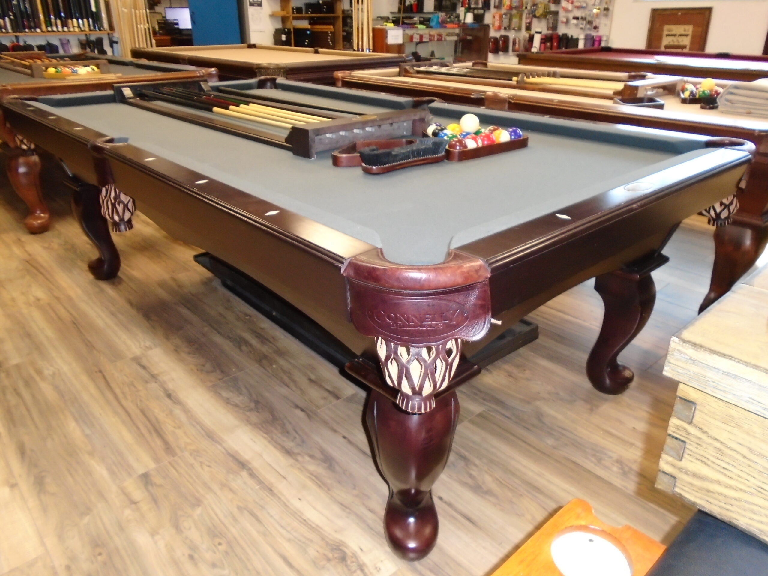 8′ Connelly Sabino pool table made in the USA. Three piece wood backed slate. Solid Maple throughout in a Dark Cherry finish. Mother of Pearl diamond sights. Queen Anne legs. Leather shield pockets with the Connelly logo stamped into the shield.