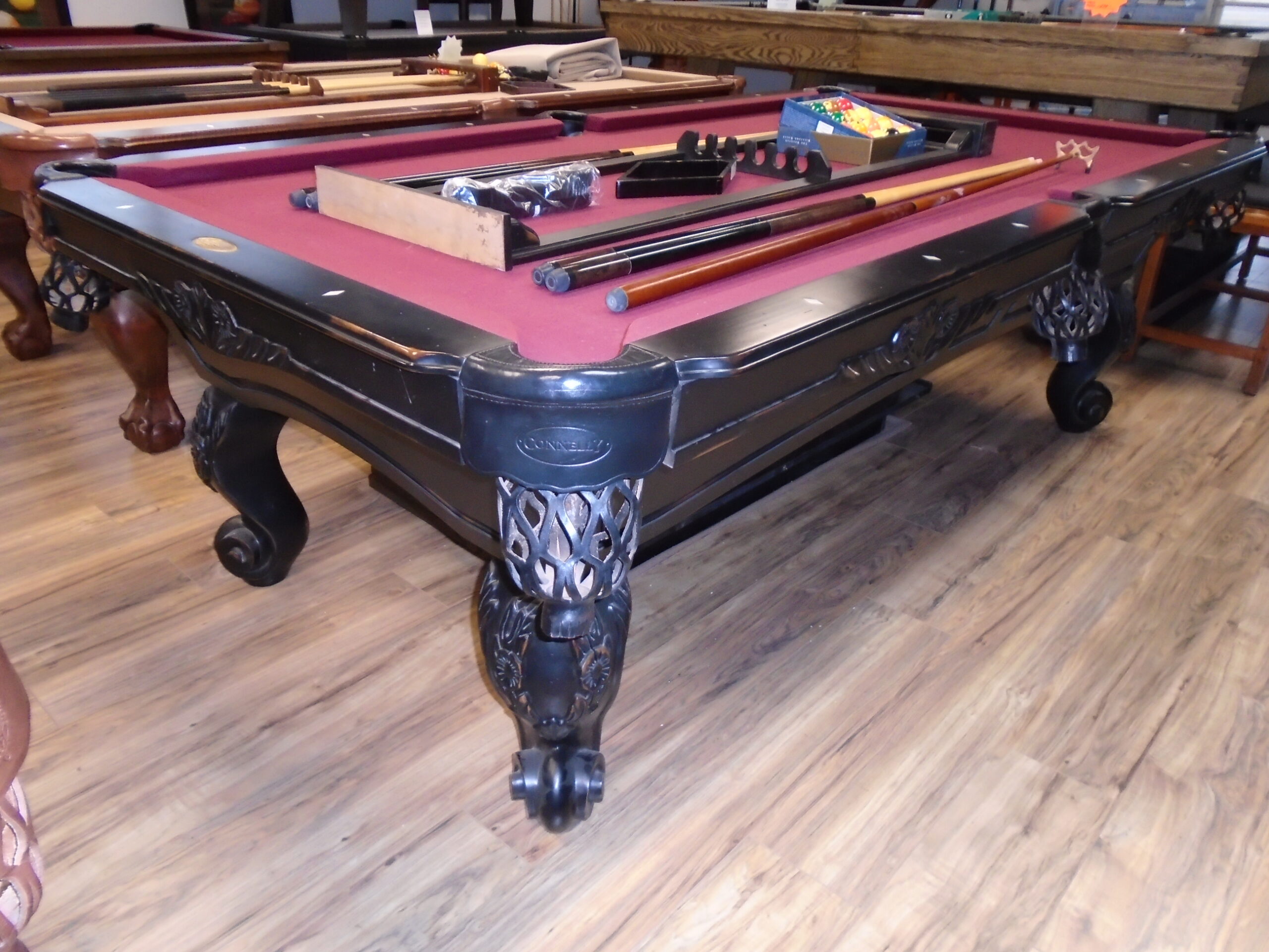 8′ Connelly Madera pool table made in the USA. Part of Connelly’s Pinnacle series it comes with the following features. Three piece 1.25 ” wood backed slate. Icon 100% gum rubber cushions guaranteed to never need replacing. Two inch thick Solid Maple rails cabinet and legs in a Antique Black finish. Designer carved legs. Wide rails for hand comfort and cue stability. Mother of Pearl diamond sights. Leather shield pockets with the Connelly logo stamped into the shield. Accessories included are over 1K in added value, 4 original Connelly cues, one piece matching wall rack, Aramith Super Pro Belgium made balls.